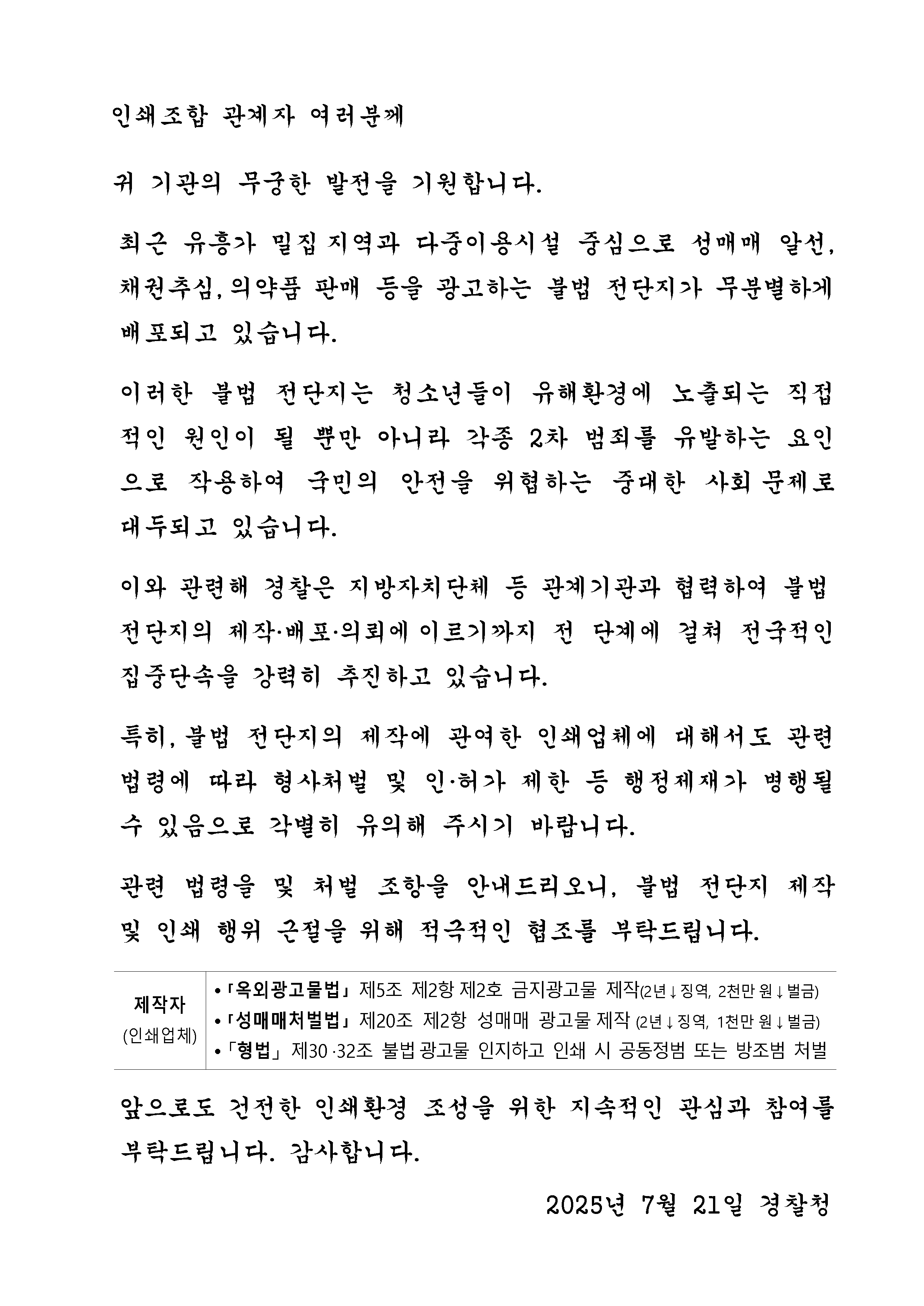 불법 전단지 제작 및 인쇄 행위 근절을 위한 안내문을 공지하오니, 참고하시기 바랍니다.